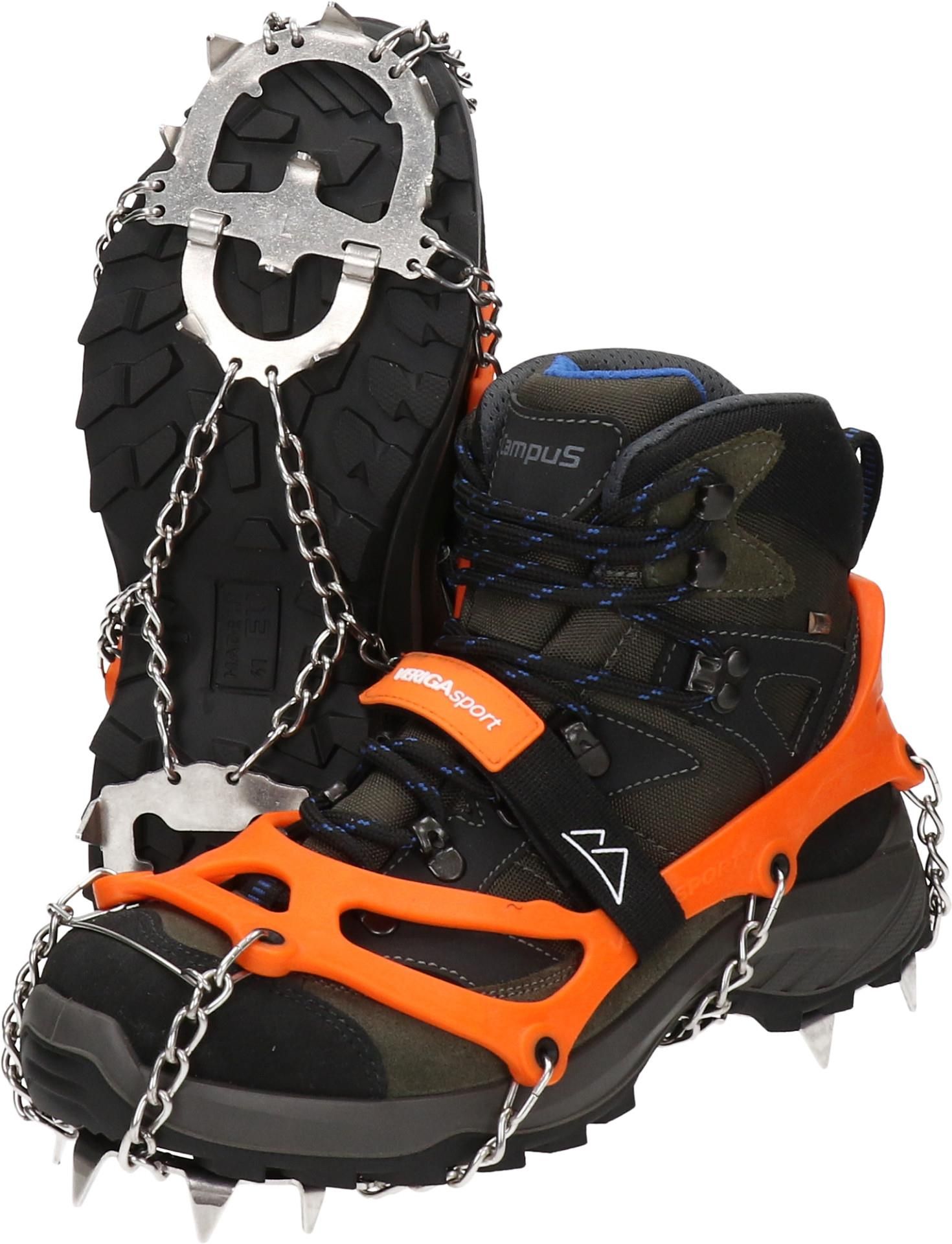 Nie Volven ale też model z Azji. Kupione co najmniej 8 lat temu z AE. Chodziliśmy w nich z grendelką w Beskidach, Tatrach i Alpach (Oberstdorf, Garmisch itp). Spokojnie dawały radę. Pod koniec stycznia zabieram je w Bieszczady. Ogniwa są tutaj skręcone w ósemkę, co w moim odczuciu dodaje im wytrzymałości na rozciąganie. Mają 8 zębów - 6 w przedniej części i 2 z tyłu. Na wysokości śródstopia nie ma żadnego (na zdjęciu guma jest słabo naciągnięta), przez to stopa nie boli nawet po chodzeniu po twardym podłożu.